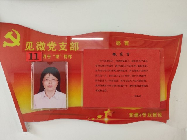 坚守职教初心,深耕物流育人。我始终以严谨务实的态度对待教学,融合理论与行业实践、锤炼技能,努力成为学生职业路上的领航者;作为物流专业教学团队的一员,我积极共享工作经验、协同打磨课程,助力提升人才培养质量,推动专业与产业同频发展。我将继续用专业与担当赋能学子,静待他们在物流行业绽放光彩。——邓新红